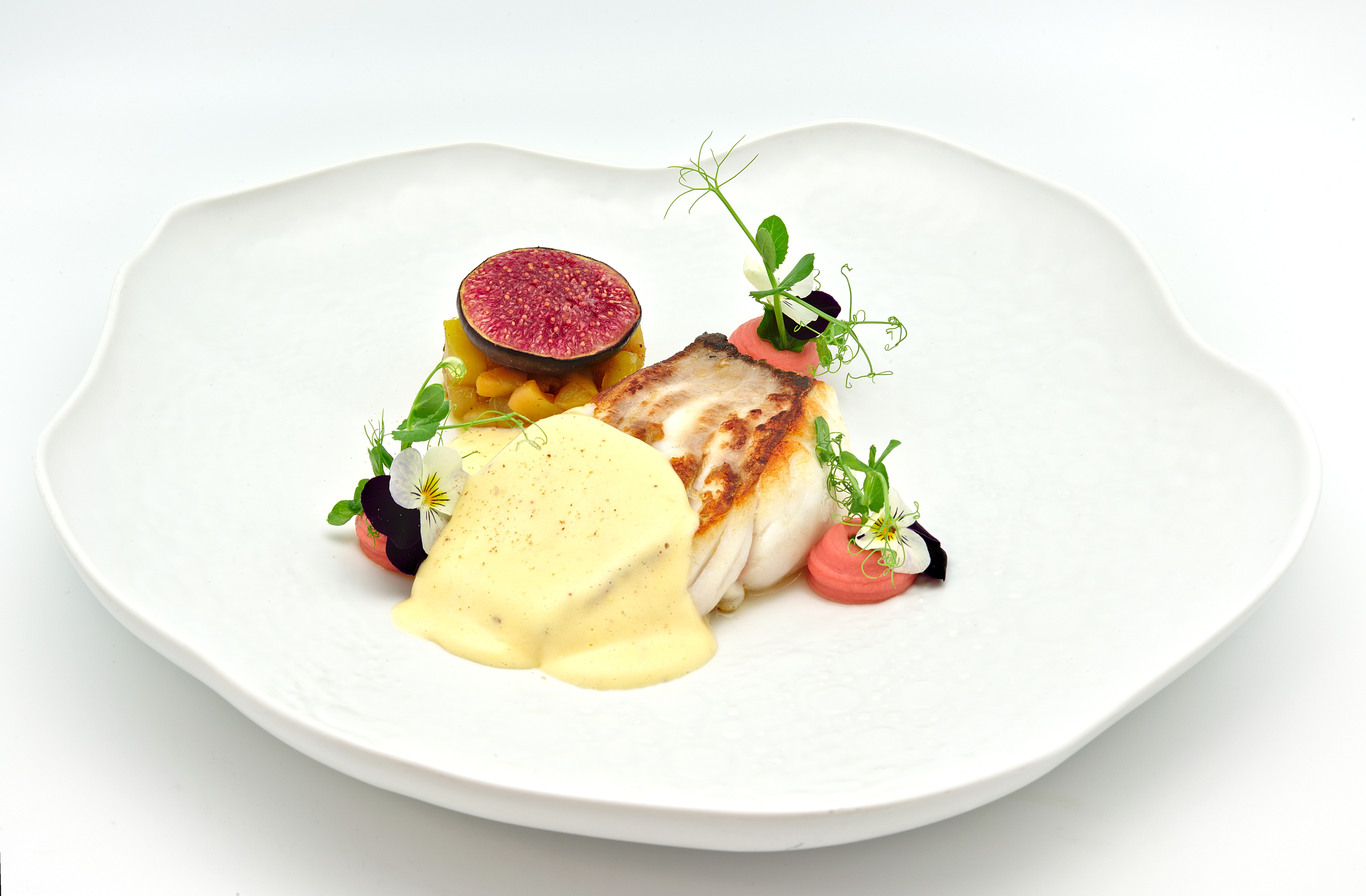 Turbot rôti au beurre de sauge (lentille corail, poire, baies de Voatsiperifery, figue & vin jaune)