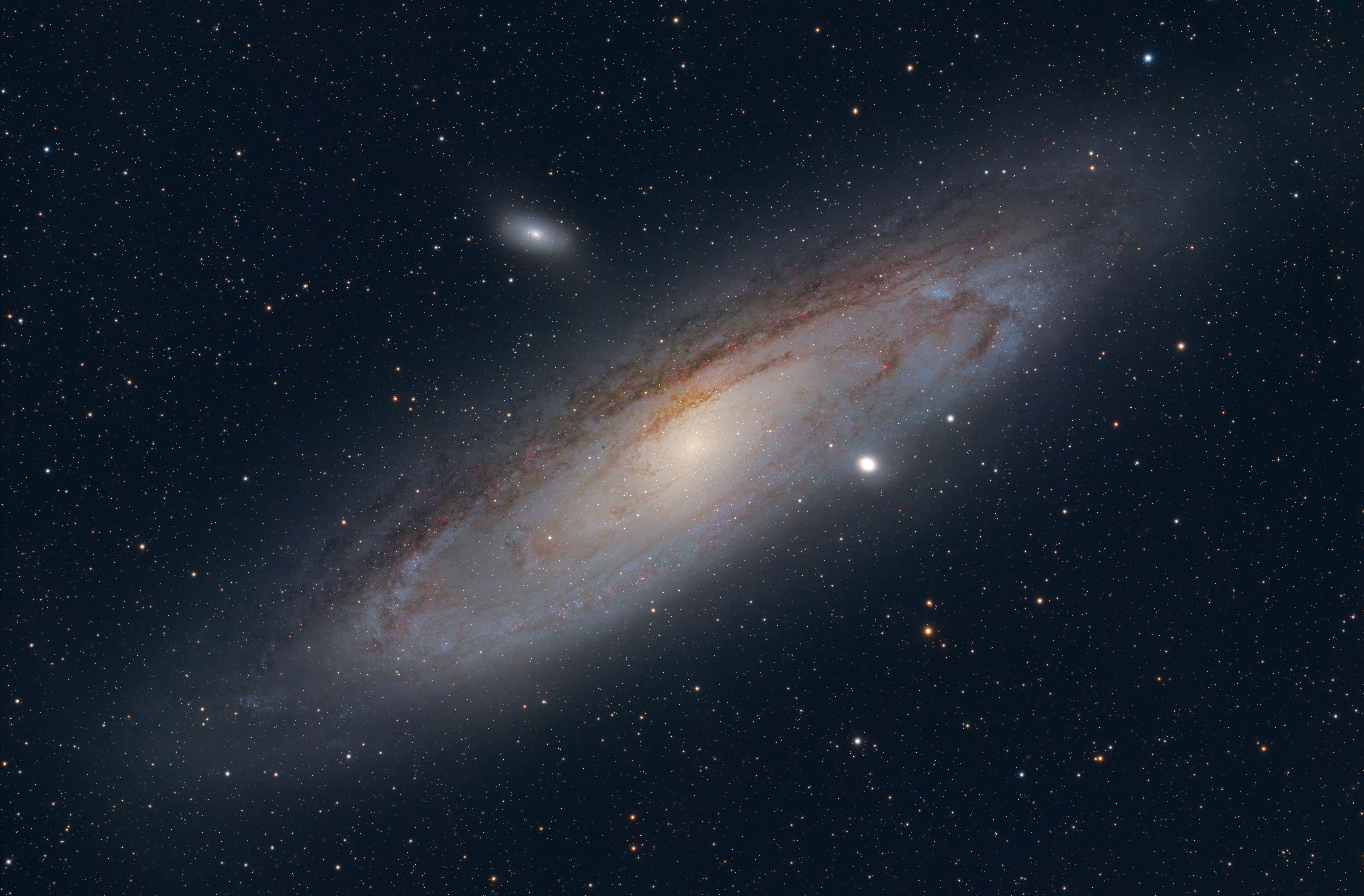 Avec un diamètre d'environ 220 000 années-lumière, elle abrite environ mille milliards d'étoiles, soit deux à cinq fois plus que notre propre galaxie, la Voie lactée. Sa magnitude visuelle de 3,4 la rend visible à l'œil nu depuis l'hémisphère nord de la Terre, ce qui en fait l'une des rares galaxies observables sans instrument.